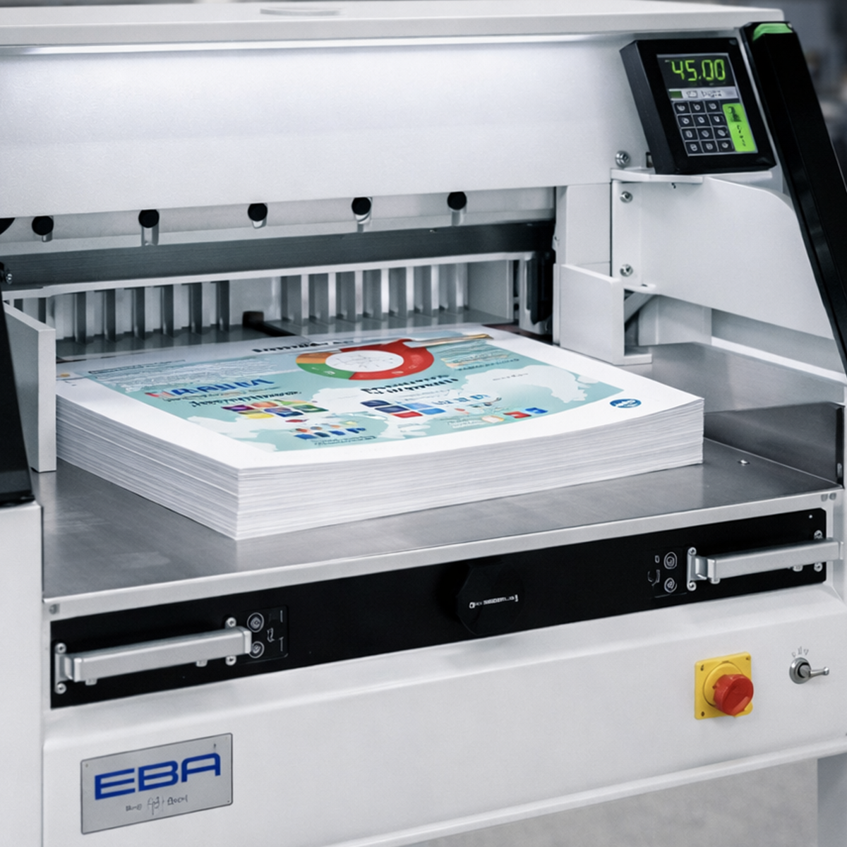 - letáky řežeme na elektromechanické stohové řezačce EBA SRA3