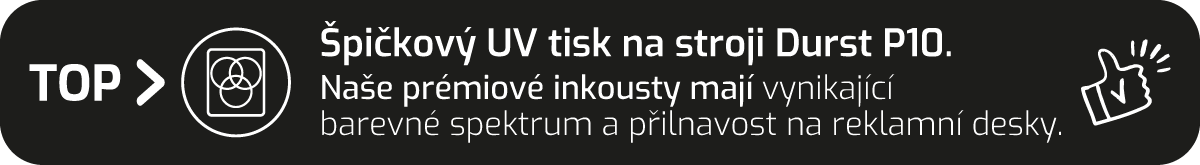 Reklamní desky tiskneme na špičkovém průmyslovém UV stroji Durst P10 s maximální šíří tisku 250 cm, který patří mezi technologickou světovou špičku v oblasti velkoformátového tisku. Díky vysokému rozlišení a nově osazeným tiskovým hlavám dosahujeme mimořádně ostrého detailu, precizní kresby a konzistentního barevného podání i u náročných grafických motivů a plnobarevných ploch. Výkon stroje umožňuje zpracování velkých objemů zakázek při zachování maximální kvality výstupu. Používáme prémiové UV inkousty s výbornou přilnavostí k deskovým materiálům, vysokou odolností a dlouhodobou barevnou stálostí. Výsledkem je profesionální tisk s čistými přechody, sytými barvami a perfektním povrchem vhodným pro interiérové i exteriérové aplikace.